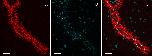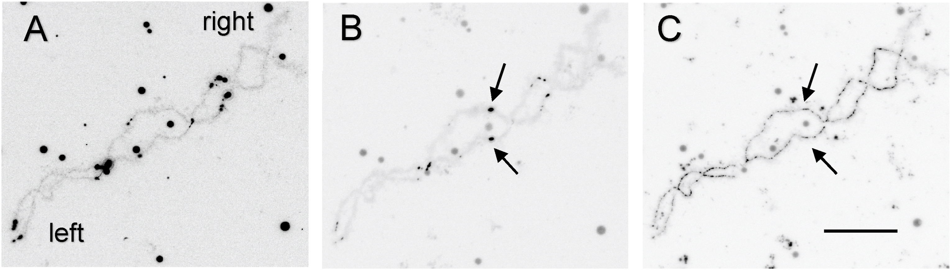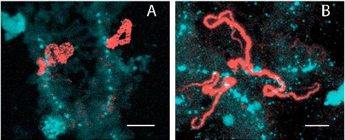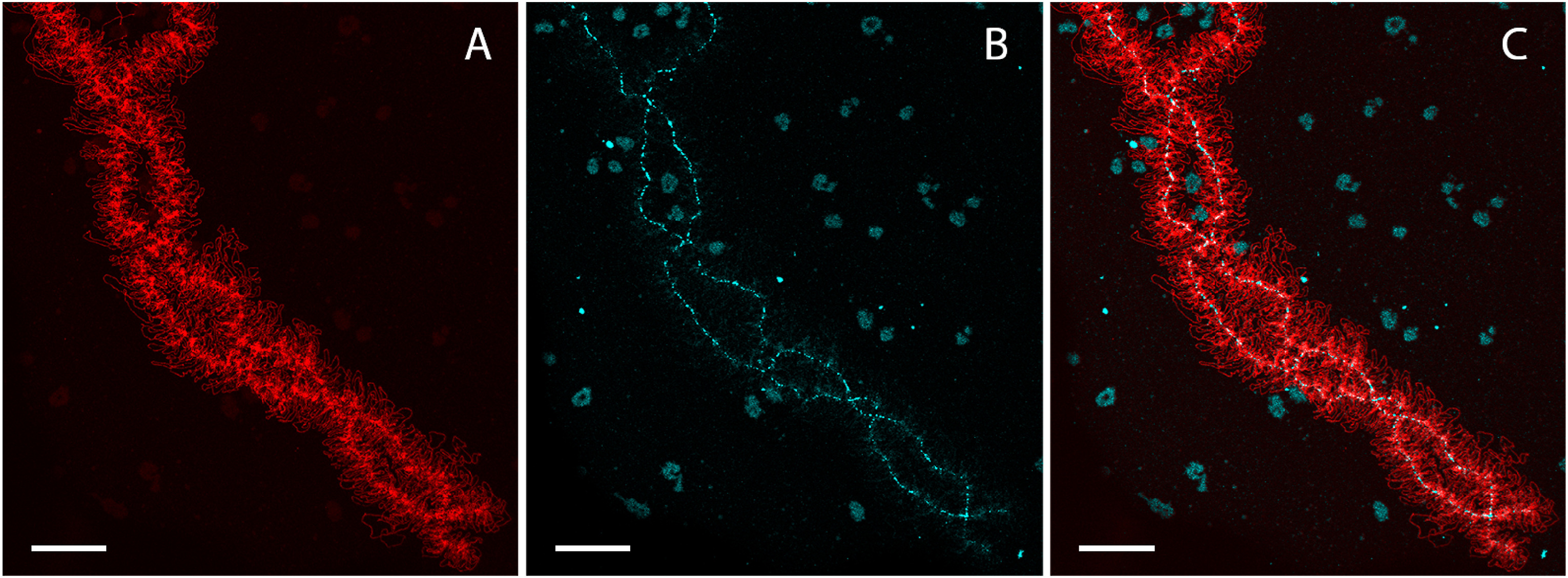 Fig. 1. An axolotl lampbrush chromosome stained with DAPI and an antibody against RNA polymerase II. A) Pol II immunostaining highlights the loops of the LBC. B) DAPI stains the condensed chromomeres along the LBC axis. C) Overlay of DAPI (cyan) and Pol II (red). Bars = 50 μm.