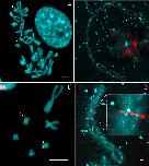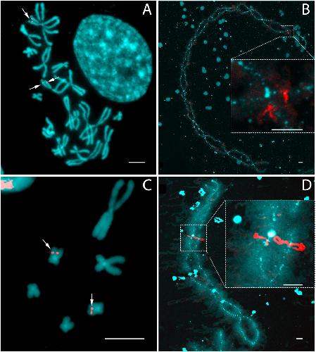 Fig. 3. BAC fluorescence in situ hybridization (FISH) on axolotl lampbrush and mitotic chromosomes. A) BAC AMMCBa_355L20 (red) localizes to the p arm of mitotic chromosome 3 and B) to a pair of loops near the telomere on the p arm of a long LBC. C) BAC clone AMMCBa_45F11 (red) localizes between the centromere and telomere on the q arm on mitotic chromosome 13 and D) to a pair of loops on the q arm of LBC 13. Chromosomes are counterstained with DAPI (cyan). Arrows point to signal from hybridization of the probe. Bars = 10 μm.