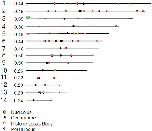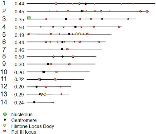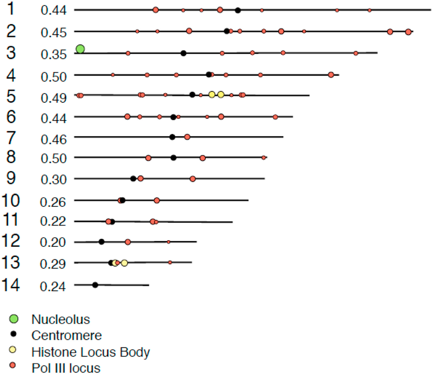 Fig. 5. Ambystoma mexicanum LBC Maps. Maps of the 14 LBCs of A. mexicanum showing positions of the centromeres, the most prominent pol III loci, the four histone locus bodies, and the single nucleolus. The fraction preceding each chromosome is the position of the centromere, measured from the left end. The relative lengths and centromere positions are in approximate agreement with those originally determined by Callan (1966) with one minor exception: reversal of chromosomes 5 and 6.