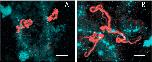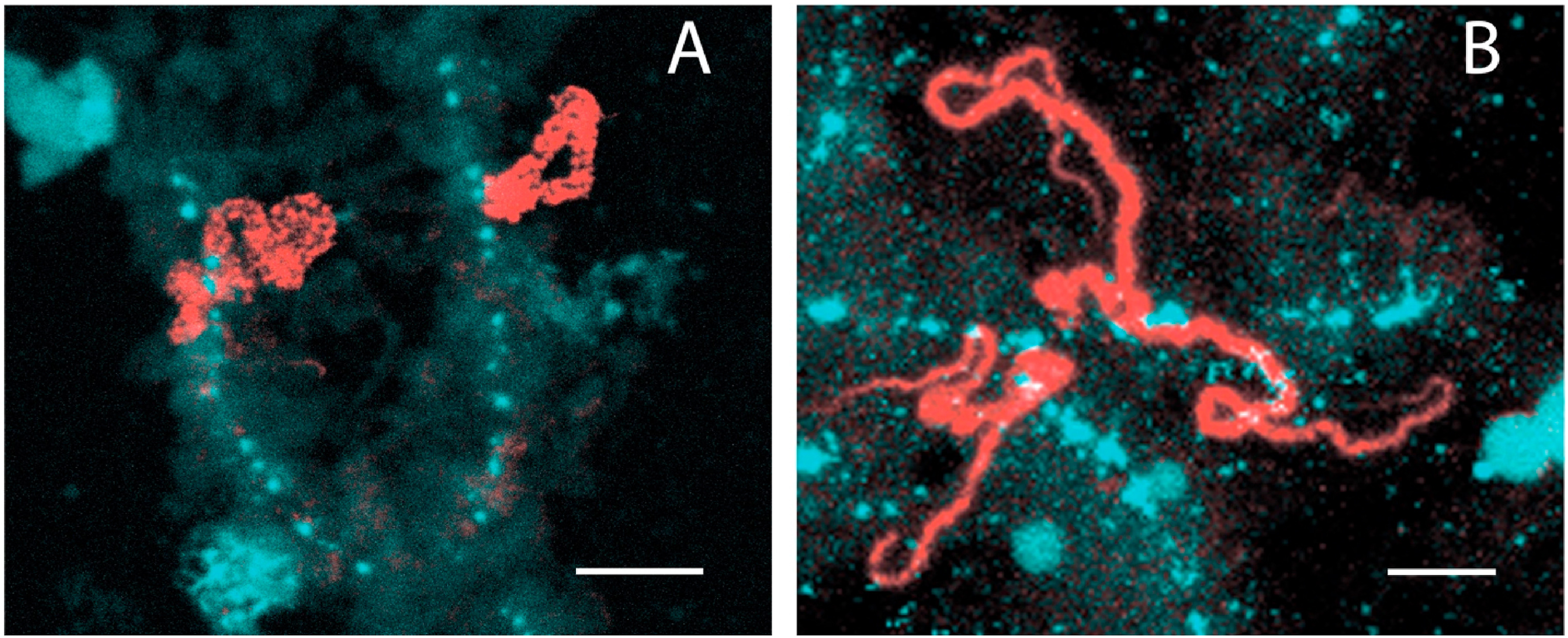 Fig. 2. BAC fluorescence in situ hybridization (FISH) on axolotl lampbrush chromosomes. A) BAC clone BbMex_4E17 (red) localizes to transcripts on a pair of loops near the telomere on the p arm of LBC 2. B) BAC clone AMMCBa_426N21 (red) localizes to transcripts on a pair of long loops on the q arm of a medium-sized chromosome. Chromosomes are counterstained with DAPI (cyan). Bars = 10 μm.