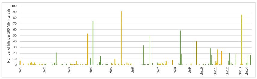 Supplementary Fig. 1. Plot of distribution of blast hits for the centromere sequence (AmexCen) across the axolotl genome assembly. The plot shows the distribution of blast hits (number of hits per 100 Mb interval) for the presumptive centromere-specific 55 base repeat. Unlike other repetitive sequences that are seen evenly distributed across the genome, the hits for this repeat are clustered in 1-2 peaks in each chromosome. Yellow and green colors are used to help distinguish each individual chromosome with yellow representing odd numbered chromosomes and green representing even.