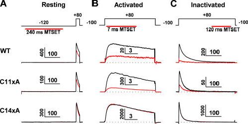 Figure 1. The T1 zinc binding site is accessible to internal MTSET in three distinct states. All channels were coexpressed with DPPX-S and KChIP-1. Wild-type (WT), C11xA, and C14xA currents from inside-out patches before (black) and after (red) the application of internal MTSET in the resting (left), activated (center), or inactivated (right) states. The units of current and time are pA and ms, respectively. Top, synchronized application of voltage steps (black line) and MTSET concentration jumps (red bar). The MTSET concentration was 200 μM for the activated state and 400 μM for the resting and inactivated states. The inhibition by MTSET during the test pulse is not apparent because the chemical modification and the resulting inhibition were slow relative to channel gating.