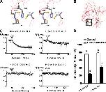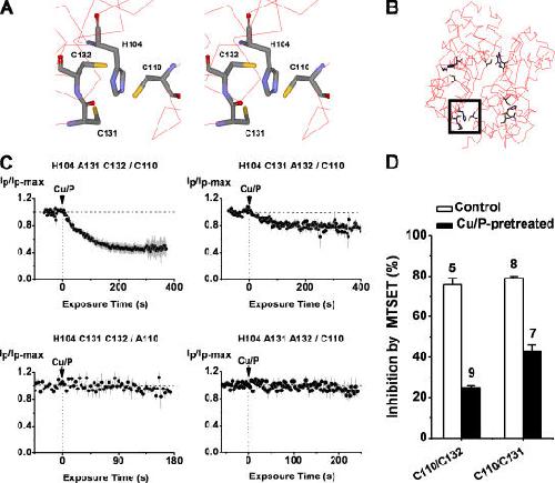 Figure 6. Disulfide bond cross-linking in the T1–T1 intersubunit interface inhibits ternary Kv4.1 channels. (A) Stereo view of the residues within the rectangle in B. C110 is from one subunit and C131, C132, and H104 are from the neighboring subunit. A standard color scheme is used to represent the relevant atoms. (B) Structural model of the Kv4 T1 domain. Colored sticks represent the residues that coordinate Zn2+ in the crystal structure, and red lines represent the rest of the T1 protein. Relative to its central axis, the model is tilted to emphasize the angle of view for the residues outlined by the rectangle. (C) The inhibition of Kv4.1 mutants by internally applied Cu/P. The available cysteines are indicated above each graph. Each symbol and corresponding error bars are the mean ± SEM of at least four experiments. (D) Bar graph summarizing the percent inhibition by MTSET (400 μM) before (white) and after treatment with Cu/P (black). The number of experiments is indicated above each bar. After the pretreatment with Cu/P, the differential inhibition of the two mutants by MTSET is statistically significant (P < 0.0001).