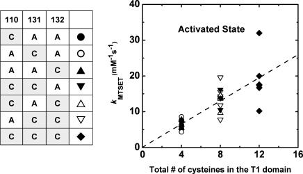 Figure 3. The kMTSET in the activated state against the total number of cysteines in the T1 tetramer. The gray boxes (left) represent the available cysteines in the T1–T1 interface for different mutants. Mutants with one cysteine are variants of C13xA and those with two cysteines are variants of C12xA. The dashed line is the best-fit linear regression with a slope of 1.65 mM−1s−1/Cys.