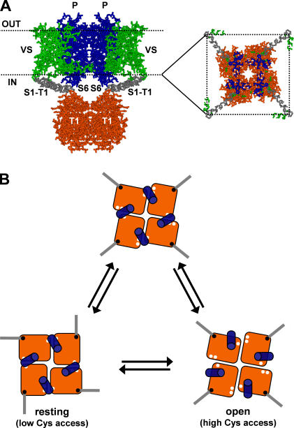 Figure 8. Coupling between voltage-dependent activation and the putative movements of the T1–T1 interfaces and the post-S6 segments. (A) Structural model of a Kv channel based on the 3D crystal structure of the Kv1.2 channel (Long et al., 2005a). The different colors depict distinct functional domains of the Kv channel: pore domain (P, blue), voltage sensing domain (VS, green; including the S4–S5 linker), and the T1 domain (T1, orange). The S1–T1 linkers (gray) connect the VS domain to the T1 domain. Dashed lines represent the approximate boundaries of the lipid bilayer. A section of the channel at the level of the internal boundary of the lipid bilayer is shown on the righthand side of the model. This view illustrates the fourfold symmetry of the channel oligomer with the S6-tails (blue) sitting just above the T1 domains and the S1–T1 linkers extending from each corner of the oligomer. (B) Two hypothetical pathways that explain the voltage dependence of the cysteine accessibility changes in the T1–T1 interface. The section shown in A (right) was used as a template to develop the schematic model of the T1 domain. The blue cylinders represent the post-S6 segments sitting on the T1–T1 interface when the pore is closed. At rest, the T1–T1 interfaces are buried. The upper pathway assumes VS domain-driven displacements of the T1–T1 interfaces via the S1–T1 linkers, which allow the concerted movement of the S6 helix bundle and the resulting opening of the pore. The lower pathway assumes the quasi-simultaneous displacements of the T1–T1 interfaces and the opening of the main S6 gate. In this case, exposing the T1–T1 interface does not depend on a propagated conformational change mediated by the S1–T1 linker. Instead, a direct interaction between the post-S6 segments and the L4 layers of T1 may drive the T1–T1 displacements as the S6 helix bundl e expands to open the pore. In both pathways, the speculative conformational changes expose the Zn2+ site cysteines in a manner that reflects the increase in conductance resulting from the opening of the main activation gate.