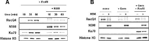 Fig. 3. The effect of N598 on the chromatin binding of RecQ4 and Ku70. (A) Sperm nuclei were added to the extracts supplemented with EcoRI and incubated for indicated periods in the presence or absence of N598 (100 nM). Then, endogenous RecQ4, N598, and Ku70 in the chromatin fractions are detected. A nonspecific band is indicated by an asterisk. (B) Sperm nuclei were incubated in the extracts supplemented with or without geminin (Gem) and EcoRI for 45 min in the presence or absence of N598 (100 nM). After the incubation, chromatin fractions were isolated and endogenous RecQ4 and N598 in the chromatin fractions are detected.