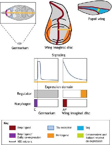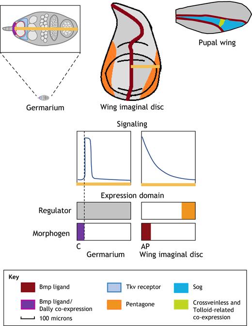 Fig. 3. Signaling gradient profiles and expression domains of BMP-patterned organs of different scales.Drosophila germarium (top left): BMP/Dpp and Dally are co-expressed in cap cells (purple). Type IV Collagen Vkg (not pictured) is expressed throughout the GSC niche. Tkv is highly expressed in somatic escort cells. GSC cells are outlined in red (image modified from Sun et al., 2010). Drosophila third instar imaginal wing disc (top middle): BMP/Dpp is expressed in a narrow stripe at the AP boundary. Pentagone is expressed at the periphery. Crossvein formation in Drosophila pupal wing disc (top right): BMP/Dpp is expressed in longitudinal veins, Sog is expressed throughout the pupal wing. Crossveinless and Tolloid-related are expressed in the future posterior cross vein location where they can act to promote BMP/Dpp signaling by liberating ligand from Sog-Dpp complexes. Lower schematics show qualitative graphs of BMP signaling gradients and the expression domains for the morphogen and negative regulator. Germarium regulator depicted as a gray box to reflect ubiquitous presence of multiple regulators including Type IV Collagen Vkg. Signaling and expression domain graphs not shown for pupal wing disc as active transport does not take place over a single axis. AP, anterior posterior boundary; C, cap cells. |