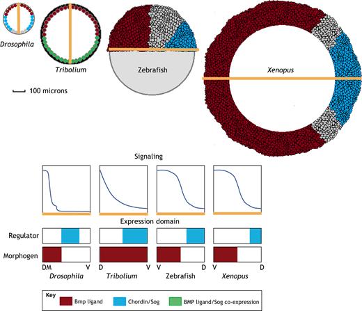Fig. 1. Signaling gradient profiles and expression domains of BMP patterned embryos. Top schematics show Dpp and Sog expression domains in the Drosophila embryo (240â μm; transverse section). Dpp expression domain and co-expression of Dpp and Sog in the Tribolium castaneum embryo (480â μm; transverse section). Expression domains of bmp ventrally and chordin dorsally in the zebrafish embryo (700â μm; late blastula) and the Xenopus embryo (1.2â mm; early gastrula, transverse section). Lower schematics show qualitative graphs of BMP signaling gradients and the expression domains for the morphogen and negative regulator. The yellow x-axis in the signaling graphs corresponds to the yellow line in the images of the top schematic. D, dorsal; DM, dorsal midline; V, ventral. |