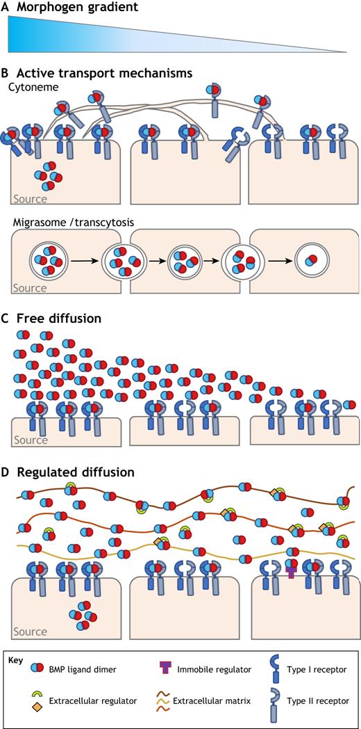 Fig. 2 Morphogen gradient formation mechanisms. (A) Morphogen gradient concept. (B) Gradient formation via active transport mechanisms: cytonemes (top) and migrasome/transcytosis (bottom). Cytonemes are cellular projections which can emanate from cells towards the morphogen source. Cytonemes carry Type II Bmp receptors which can take ligand back to the cell where they can signal in a receptor complex. Migrasome/transcytosis shows vesicle-based transport of ligand away from the source. (C) Gradient formation by free (passive) diffusion. Ligand diffuses from areas of high concentration near the source to areas of lower concentration. Pre-steady state ligand concentration is depicted. (D) Gradient formation via regulated diffusion. Extracellular matrix, immobile regulators and diffusible extracellular regulators all act to regulate diffusion. Note: receptors and ligands not to scale. |