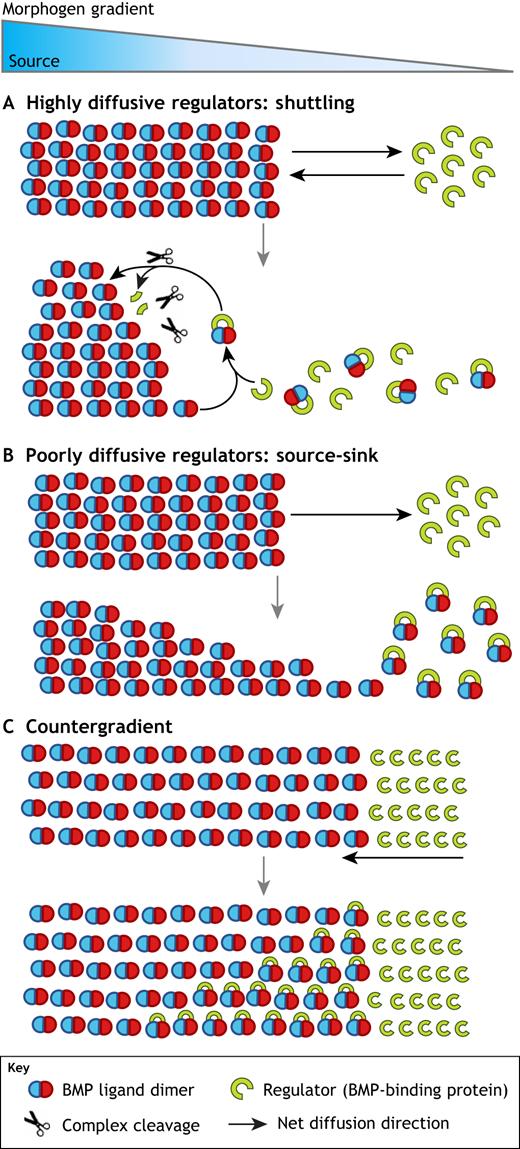 Fig. 4. Diversity of regulatory mechanisms. (A) Highly mobile regulators can engage in shuttling processes, which have concentrating effects. Often ligand gradients end up smaller than their expression domain. Shuttling mechanisms establish peak signaling opposite of the regulator, regardless of where morphogen is expressed. (B) Poorly diffusive regulators have primarily inhibitory effects as they bind ligand and block signaling. This can act in a source-sink function as the ligand diffuses towards the ‘sink’ of immobile regulators. (C) Countergradients involve highly mobile regulators, as in shuttling. However, countergradient regulators do not have any pro-signaling functions. |