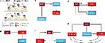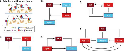 Fig. 5. Shuttling and extracellular regulation. (A) BMP/Dpp shuttling as observed in Drosophila DV patterning. Sog binds Dpp/Scw ligand heterodimer and forms a Type IV Collagen bound complex that prevents signaling in areas of high Sog concentration. Tsg disrupts Sog-Dpp/Scw binding to Collagen and enables diffusion. Tsg also acts as a scaffold to promote Tolloid-mediated Sog cleavage and Dpp/Scw liberation. In areas with high Sog levels, the liberated ligand heterodimer typically reforms a Sog complex and begins another round of shuttling. In high Tolloid and low Sog levels areas, the ligand heterodimer is free to signal. Iterative rounds of complex formation and cleavage have the effect of moving ligand away from Sog expression, leading to a concentrated high peak at the dorsal midline. (B-F) Network diagrams of extracellular BMP regulation in diverse contexts. (B) BMP influences its own extracellular regulation in embryonic axis formation. BMP signaling leads to upregulation of the ventral protein Sizzled, which competitively inhibits Tolloid and prevents Tolloid-mediated Chordin cleavage. (C) In the Drosophila germarium, downstream BMP signaling target, Myc, provides positive feedback by upregulating BMP ligand uptake. Brat creates a bistable switch for differentiation by inhibiting BMP signal transduction and Myc activity. (D) In the Drosophila wing disc, Pent, a secreted factor that is negatively regulated by BMP signaling, supports BMP signaling by directing the internalization of Dally, a negative regulator of BMP signaling. (E) In the Drosophila embryo, downstream BMP signaling products Eiger and Cv-2 provide positive and negative feedback, respectively, to BMP signaling. These feedback mechanisms act to fine tune the BMP gradient and confer spatial bistability. (F) In zebrafish, Pinhead and Admp both act to support BMP signaling by promoting Chordin degradation. Pinhead and Admp are both downregulated by each other and by BMP signaling. The reciprocal repression circuit of Admp and Pinhead provides robustness in BMP gradient formation. |