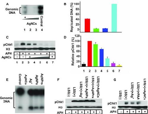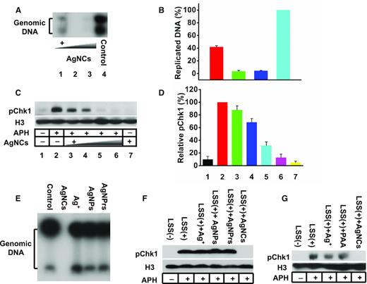 Figure 2. AgNCs uniquely inhibit DNA replication and replication checkpoint. (A, B) DNA replication in extracts is sensitive to AgNCs. (A) Xenopus egg extracts were incubated with sperm nuclei in the presence of increasing concentrations of AgNCs. DNA replication was monitored by agarose gel electrophoresis after incorporation of α-[32P]dCTP into genomic DNA. (B) Quantification of three independent experiments normalized to untreated controls. (C, D) AgNCs inhibit the DNA replication checkpoint. (C) Xenopus egg extracts were treated with aphidicolin with or without AgNCs at different concentrations and incubated with sperm nuclei. ATR activation was monitored by pChk1 western blotting. (D) Quantification of three independent experiments normalized to aphidicolin alone control. Impact of different silver nanomaterials on DNA replication and replication checkpoint. (E) Replicating extracts were incubated with silver ions (Ag+), silver nanoparticles (AgNPs), silver nanoprisms (AgNPrs) and silver nanoclusters (AgNCs) and DNA replication was assessed by incorporation of α-[32P]dCTP into genomic DNA. (F, G) The impact of Ag+, AgNPs, AgNPrs AgNCs and PAA on DNA replication checkpoint was monitored by pChk1 Western blotting.