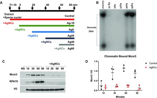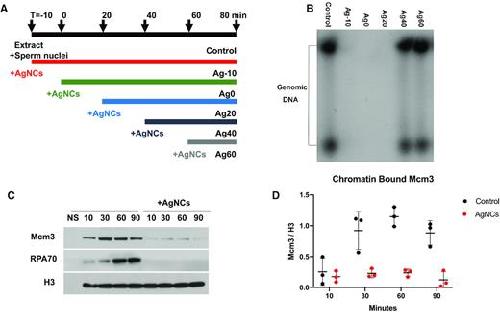 Figure 3. AgNCs affect DNA replication initiation. (A, B) Time-course of DNA replication assay. (A) Experiment time-course showing the time of AgNCs addition to DNA replication assay. (B) AgNCs were added to extracts at different time points during DNA replication (T = â10, 0, 20, 40, 60 min) and DNA replication products were monitored by agarose gel electrophoresis at 80 min after addition of AgNCs. For the first lane (control), no AgNCs were added and replication was monitored at 80 min. (C, D) AgNCs block pre-RC assembly. (C) Chromatin binding assays were performed in Xenopus egg extracts supplemented with demembranated sperm nuclei (2500 sperm/μl) and incubated for 10 min at 21°C for chromatin assembly following addition of AgNCs at indicated timepoints (10, 30, 60 and 90 min). Chromatin was isolated through 30% sucrose cushions and bound proteins were resolved by SDS-PAGE on 10% Bis-Tris gels and probed with specific antibodies against MCM3, RPA and histone H3. (D) The mean and standard deviation is shown for three ieendependent biological replicates.