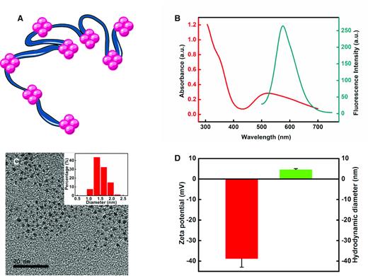 Figure 1. Synthesis and characterization of silver nanoclusters (AgNCs). (A) Schematic diagram of AgNCs. (B) Absorbance and fluorescence spectra of AgNCs. (C) Transmission electron microscopy (TEM) image and corresponding size distribution histogram of AgNCs. Scale bars, 20 nm. (D) Zeta potential and hydrodynamic diameter of AgNCs.