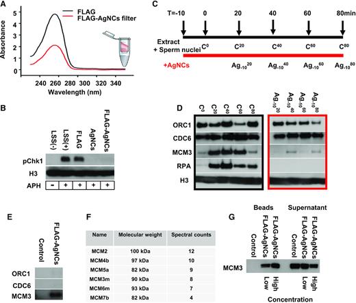 Figure 4. AgNCs interact with MCM protein complex. (A) Synthesis of FLAG-AgNCs (FLAG peptide: CGGMDYKDHDADYKDHDIDYKDDDDK). The decrease of FLAG peptide absorbance in the filter indicated the successful linkage of FLAG peptide on AgNCs. (B) FLAG-tagged AgNCs inhibits the DNA replication checkpoint. Xenopus egg extracts were treated with aphidicolin with or without AgNCs or FLAG-AgNCs and incubated with sperm nuclei. ATR activation was monitored by pChk1 western blotting. (C, D) Chromatin binding assay in the presence of FLAG-AgNCs. (C) Schematic representation of the experiments. (D) Chromatin was isolated through 30% sucrose cushion and bound proteins (ORC1, CDC6, MCM3, RPA and histone H3) resolved by 3%-8% gradient Tris-Acetate gels followed by western blot. Left: control, untreated extarcts. Right: extracts incubated with FLAG-tagged AgNCs. (E) Xenopus egg extracts were incubated with FLAG peptide (control) or FLAG-AgNCs, immunoprecipitated with anti-FLAG antibodies, whashed and processed for western blot with ORC1, CDC6 and MCM3 antibodies. (F) Xenopus egg extracts were incubated for 1 h with FLAG-AgNCs. Following FLAG immunoprecipitation, AgNCs-bound proteins were identified by mass spectrometry. MCM polypeptides recovered are indicated. (G) Purified hexameric MCM complex expressed in baculovirus-infected cells was incubated with FLAG-AgNCs in vitro. Bound and soluble fractions were processed for Western blotting with MCM3 antibodies.