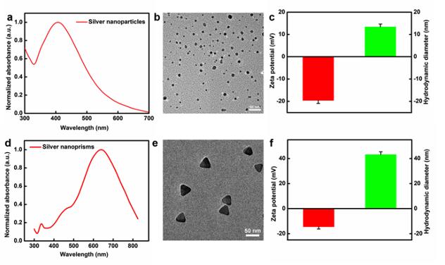 Figure S1. Synthesis and characterization of silver nanoparticles (AgNPs) and silver nanoprisms (AgNPrs). (a, d) Absorbance and fluorescence spectra of AgNPs and AgNPrs. (b, d) Transmission Electron Microscopy (TEM) images of AgNPs and AgNPrs. Scale bars, 50 nm. (c, f) Zeta potential and hydrodynamic diameter of AgNPs and AgNPrs. We confirmed the successful generation of silver nanoparticles (AgNPs) and silver nanoprisms (AgNPrs) by optical absorption and transmission electron microscopy (TEM). As shown in Figure S2a, AgNPs exhibit the characteristic absorption peaks at 420 nm, which are assigned to AgNPs (1,7). Figure S2b shows typical TEM image of the AgNPs prepared as described, in which AgNPs were monodispersed with an average size of about 10 nm. Dynamic light scattering characterization (Figure S2c) indicates that zeta potential and hydrodynamic diameter of AgNPs were –19.64 ± 1.34 mV and 13.44 ± 1.22 nm, respectively. Similarly, we also assessed the properties of the AgNPrs by monitoring the UV−vis absorption spectra, the size and shape by transmission electron microscopy (TEM) and the zeta potential. Figure S2d shows the UV−vis absorption spectrum of AgNPrs with two characteristic bands at 665 nm ascribed to in-plane dipole resonance and at 335 nm corresponding to out-of-plane quadrupolar resonance (2,8). The representative TEM picture in Figure S2e shows that AgNPrs exhibited a triangular prism structure with an edge length between 30 and 40 nm. Dynamic light scattering and zeta potential measurements (Figure S2f) indicate that the average hydrodynamic size and surface charge are about 43.27 nm and −14.51 mV, respectively.