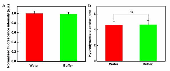 Figure S2. (a) Normalized fluorescence intensity of AgNCs after 6 hours incubation in water or in replication assay buffer. (b) Hydrodynamic diameter of AgNCs in water and in replication assay buffer.