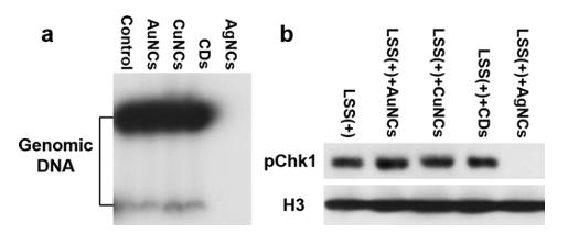 Figure S4. (a) Replicating extracts were incubated with gold nanoclusters (AuNCs), copper nanoclusters (CuNCs), carbon dots (CDs) and silver nanoclusters (AgNCs) for 90 minutes, and DNA replication was assessed by incorporation of α-[32P]dCTP into genomic DNA. (b) The impact of AuNCs, CuNCs, CDs and AgNCs on DNA replication checkpoint was monitored by pChk1 Western blotting.