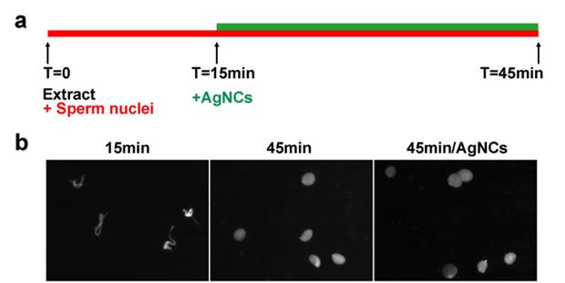 Figure S5. AgNCs does not inhibit nuclear assembly. (a) Schematic representation of the experiments. (b) Nuclear assembly in Xenopus egg extracts in the presence of AgNCs. Nuclear formation was followed over the course of 45 min by fluorescence microscopy with DAPI.