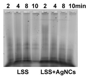 Figure S6. Micrococcal nuclease digestion of chromatin fractions in assembled in LSS extracts in the presence of AgNCs. Chromomal DNA was purified after nuclease digestion for the indicated times and separated by 1.5% TBE-agarose gel electrophoresis.