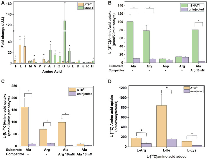 Amino acid transporters play a vital role in metabolism and nutrient signaling pathways. Typically, transport activity is investigated using single substrates and competing amounts of other amino acids. We used GC-MS and LC-MS for metabolic screening of Xenopus laevis oocytes expressing various human amino acid transporters incubated in complex media to establish their comprehensive substrate profiles. For most transporters, amino acid selectivity matched reported substrate profiles. However, we could not detect substantial accumulation of cationic amino acids by SNAT4 and ATB0,+ in contrast to previous reports. In addition, comparative substrate profiles of two related sodium neutral amino acid transporters known as SNAT1 and SNAT2, revealed the latter as a significant leucine accumulator. As a consequence, SNAT2, but not SNAT1, was shown to be an effective activator of the eukaryotic cellular growth regulator mTORC1. We propose, that metabolomic profiling of membrane transporters in Xe nopus laevis oocytes can be used to test their substrate specificity and role in intracellular signaling pathways.