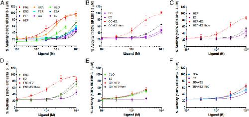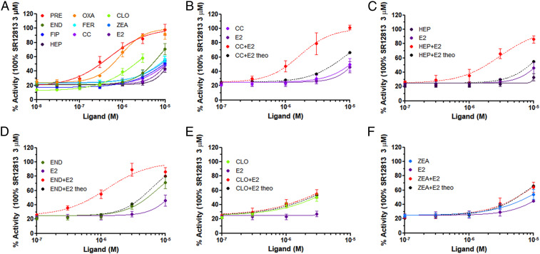 Fig. 1. Compound activity in transactivation assays using the HG5LN GAL4-PXR-LBD cell line. (A) Cells were exposed to different concentrations of test compounds. Assays were performed in quadruplicate in at least three independent experiments, and data are expressed as mean (±SEM). Note that, because of toxicity issues, CLO could not be used at concentrations above 3 µM. (B–F) Cells were exposed to compounds in binary mixtures as indicated. Black dashed lines represent the theoretical activation curves obtained for the additive combination of individual compound activities calculated using the Bliss independence model (20). Assays were performed in quadruplicate in at least three independent experiments, and data are expressed as mean (±SEM).