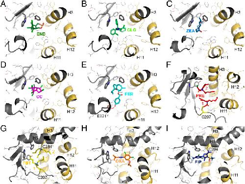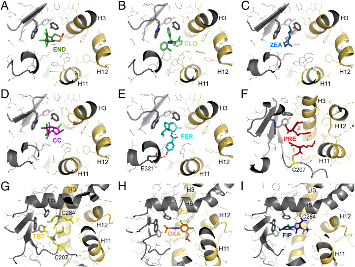 Fig. 2. Chemicals bind to PXR with varied binding mechanisms and pocket occupancies. (A–I) Close-up view of the LBP of PXR bound to the various test compounds. The chemicals (color code for carbon atoms as in Fig. 1A) and residues belonging to the aromatic cage (gray) are shown as sticks. Other residues are displayed as lines. Oxygen, nitrogen, sulfur, and chlorine atoms are colored in red, blue, yellow, and green, respectively. Residues and secondary structural elements discussed in the text are labeled.