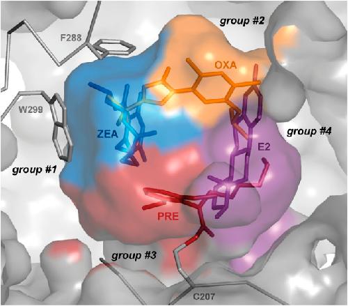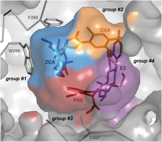 Fig. 3. Differential occupancy of the PXR LBP. The four PXR LBP subpockets defined in this study are displayed and labeled. One compound representative of each group is shown within its subpocket. Both the ligands and their pockets are colored following the code used in Fig. 1A.
