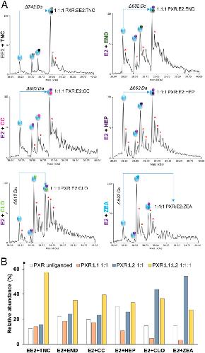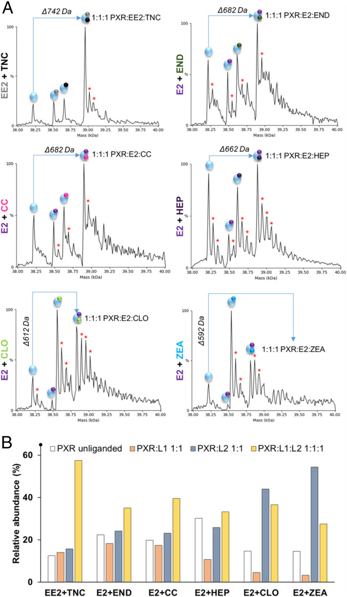 Fig. 4. Analysis of ligand-binding cooperativity by native MS. (A) Native ESI-MS was used to characterize PXR LBD in the presence of six binary mixtures as indicated. Asterisks indicate acetate adducts. (B) Relative abundance distributions of unliganded and liganded PXR (L1, EE2 or E2; L2, TNC, END, CC, HEP, CLO, or ZEA) derived from native MS analyses of PXR LBD (5 µM) in the presence of 2 molar equivalents of EE2/TNC, E2/END, E2/CC, E2/HEP, E2/CLO, and E2/ZEA ligand mixtures (10 µM each).