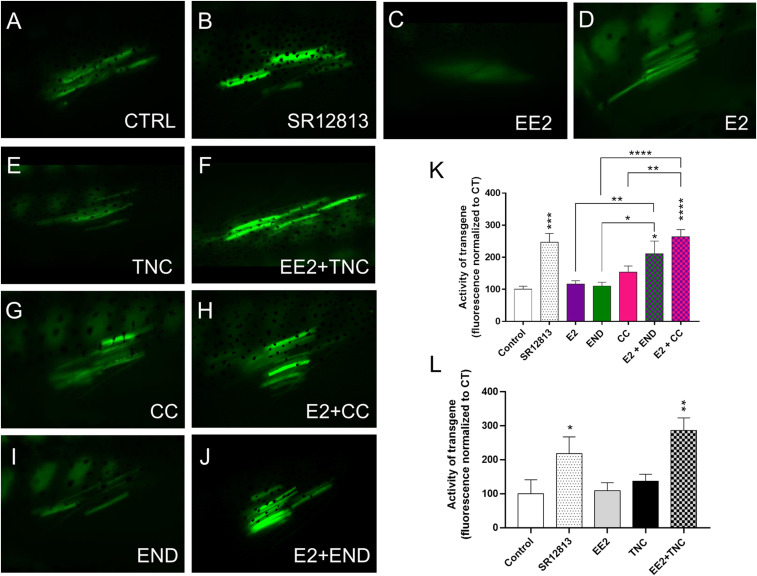 Fig. 5. PXR-driven transactivation is synergistically activated in vivo. Transient transactivation of human PXR LBD. Somatic transgenesis in tadpole tail muscle of two GFP–reporter constructs (CMV-Gal4 DBD-PXR LBD + 5UAS-GFP) was done at day 0. After 8 d of treatment with daily renewal, GFP expression was measured from pictures using ImageJ. (A–J) Magnification (40×) of representative tail skeletal muscle fibers (one per group) after treatment with (A) solvent, (B) PXR synthetic agonist SR12813 1 µM, (C) 17α-ethinylestradiol EE2 1 µM, (D) 17β-estradiol E2 1 µM, (E) TNC 1 µM, (F) TNC + EE2 1 µM each, (G) CC 0.1 µM, (H) E2 1 µM + CC 0.1 µM, (I) END 5 nM, and (J) E2 1 µM + END 5 nM. (K and L) Quantification of fluorescence and statistical analysis. Experiments were performed at least three times (n > 8 for each condition), providing similar results (*P < 0.05, **P < 0.01, ***P < 0.001, ****P < 0.0001).