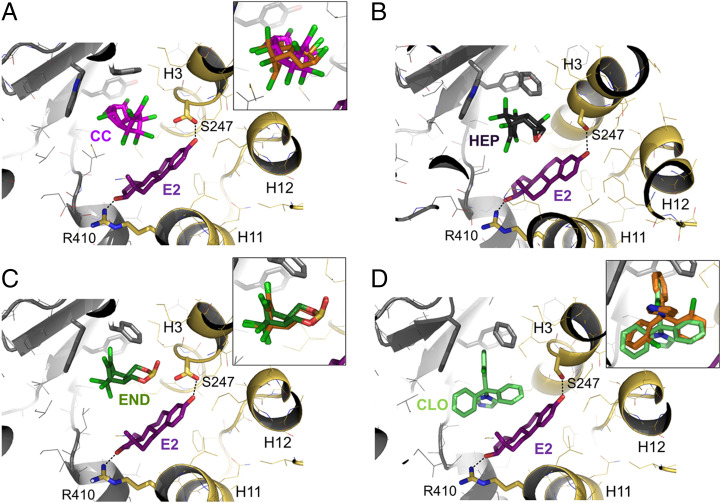 Fig. 6. The binding modes of binary mixtures as revealed by X-ray crystallography. Close-up view of the LBP of PXR bound to 17β-estradiol (E2) and (A) CC, (B) HEP, (C) END, and (D) CLO. The compounds (color code for carbon atoms as in Fig. 1A) and residues belonging to the aromatic cage (gray) are shown as sticks. Other residues are displayed as lines. Oxygen, nitrogen, sulfur, and chlorine atoms are colored in red, blue, yellow, and green, respectively. Residues and secondary structural elements discussed in the text are labeled. (Insets) Comparison of the binding modes of CC, END, and CLO in the presence and absence of E2.