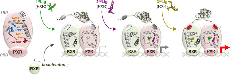Fig. 8. Model for synergistic activation of the PXR signaling pathway by ternary mixtures of EDCs. Together with previous ones, our study shows that the LBP of PXR displays several specific structural features accounting for its role as a sensor responding to a wide variety of chemicals. They comprise an aromatic π-trap (π trap), two reactive cysteine residues (C207, C284) available for covalent coupling or highly dynamic and conformable secondary structural elements (Dyn. SSE). Upon binding of an environmental ligand to PXR, transcriptional coactivators are recruited by the DNA-bound RXR–PXR heterodimer via the interaction of one of their LxxLL binding motifs (gray ovals) with the coactivator binding site (CBS) of PXR, thus inducing the transcription of target genes. However, rather than single molecules, human exposure involves a broad mix of chemicals, which may act in a synergistic manner, possibly through the two converging mechanisms identified in this work. Both rely on the binding cooperativity of: 1) a second compound that physically assembles with the first one into the PXR LBP to form a supramolecular ligand with improved functional properties in regard to those of its individual components, or 2) a second coactivator LxxLL motif upon RXR activation insuring a robust interaction of the coactivator with the RXR–PXR heterodimer (highlighted by red ovals).