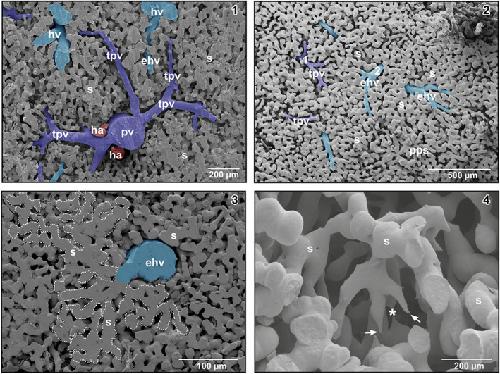 FIGURE 4. (1) Spruce tree‐like branching pattern of a portal venule (pv). Detail from a transverse sectioned specimen. Note an efferent hepatic venule (ehv) between terminal portal venules (tpv). (2) Vascular pattern of the parieto‐pleural surface of the liver. Note terminal portal venules (tpv, 1) and efferent hepatic venules (ehv, 2). (3) Territory of interconnected sinusoids (encircled area) which drains into an efferent hepatic venule (ehv). (4) Three‐dimensional network of sinusoids (s) displaying blind ending tapered vascular structures (arrows) as signs of ongoing sprouting angiogenesis. Note the close by thin sinusoid (asterisk)