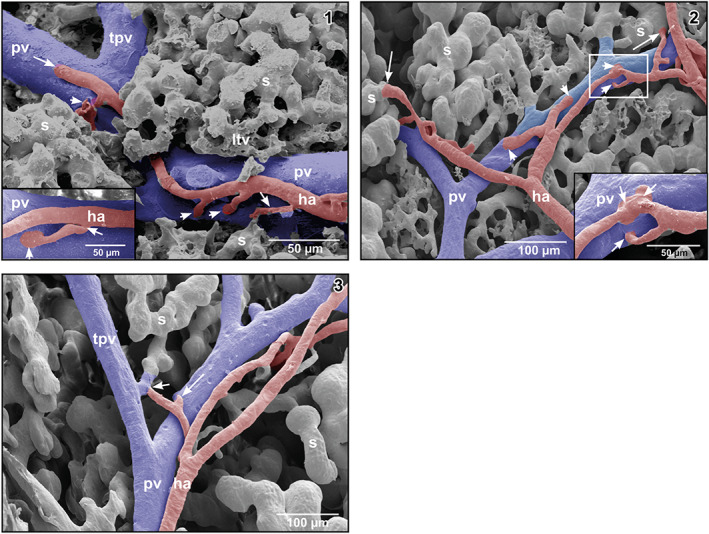 FIGURE 5. (1) Hepatic arteriole (ha) running along a portal venule. Note that the arteriole first gives off a branch to a sinusoid forming an arteriolar‐sinusoidal anastomosis (ASA; small arrow), then two branches to the fellow portal venule forming arteriolar‐portal (venous) anastomoses (APAs; arrowheads) to finally anastomose with the fellow portal venule (large arrow). Inset Short arteriolar‐portal anastomosis (APA). Note the widened inlet portion (arrowhead) and the narrowing of the hepatic arteriole at its origin from the parent hepatic arteriole (arrow). (2) Arteriolar‐portal (APAs) and ASAs. Note spacing and trumpet‐like shape of the arteriolar inlet portions in APAs (arrowheads) and ASAs (arrows). Inset Enlargment of the framed area displaying three closely spaced APAs (arrows). (3) Hepatic arteriole joining a tubular inlet portion of a sinusoid (short arrow). The long arrow points at an arteriole that in this angle of view seems to join the portal venule, but does not do so. This was confirmed by changing the tilting angle during SEM work