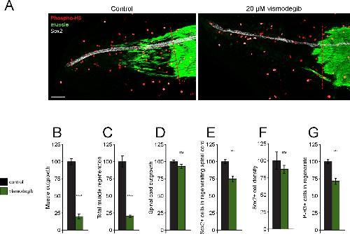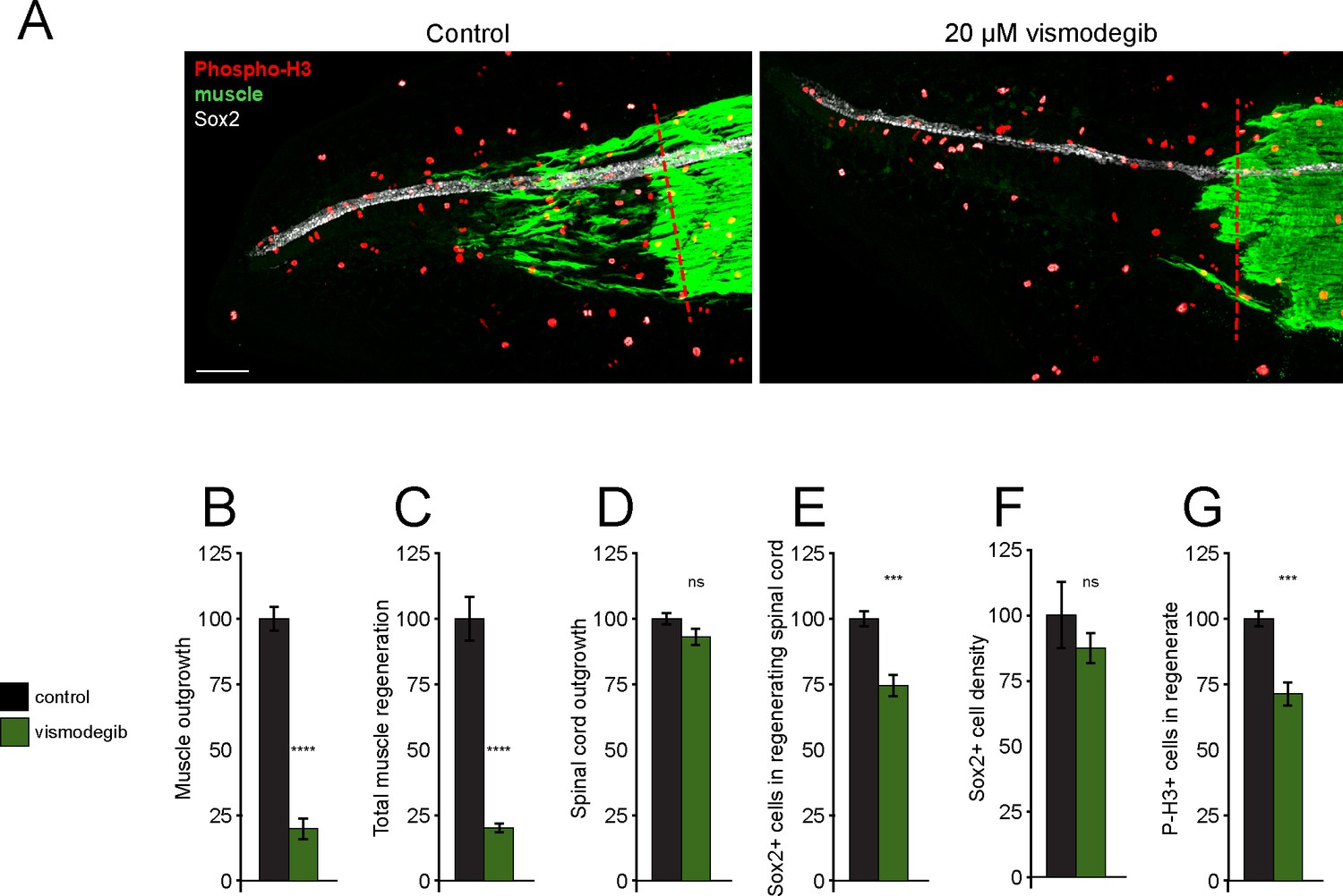 Figure 1—figure supplement 2 Treatment with Smoothened (Smo) antagonist vismodegib reduces muscle and spinal cord regeneration. Stage 39–40 X. laevis larvae were incubated with vehicle (0.1% DMSO, Control) or 20 µM vismodegib for 72 hr, then immunostained. (A) Representative z-projections of whole-mount immunostained samples for both groups at 72 h post amputation (hpa). Transverse red dashed line indicates amputation plane. Scale bar 100 µm. (B–G) Graphs show mean ± SEM regenerated muscle outgrowth (B) and total new muscle volume (C), regenerated spinal cord outgrowth (D), total number (E) and per length density (F) of Sox2+ cells in the regenerated spinal cord, and number of phospho-histone H3+ (P-H3+) cells (G) in the regenerate at 72 hpa as % of cohort-matched control. N of larvae: 8–10 samples per group. ***p<0.001, ****p<0.0001, ns: not significant, two-tailed t-test. |