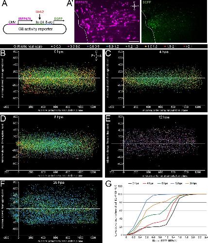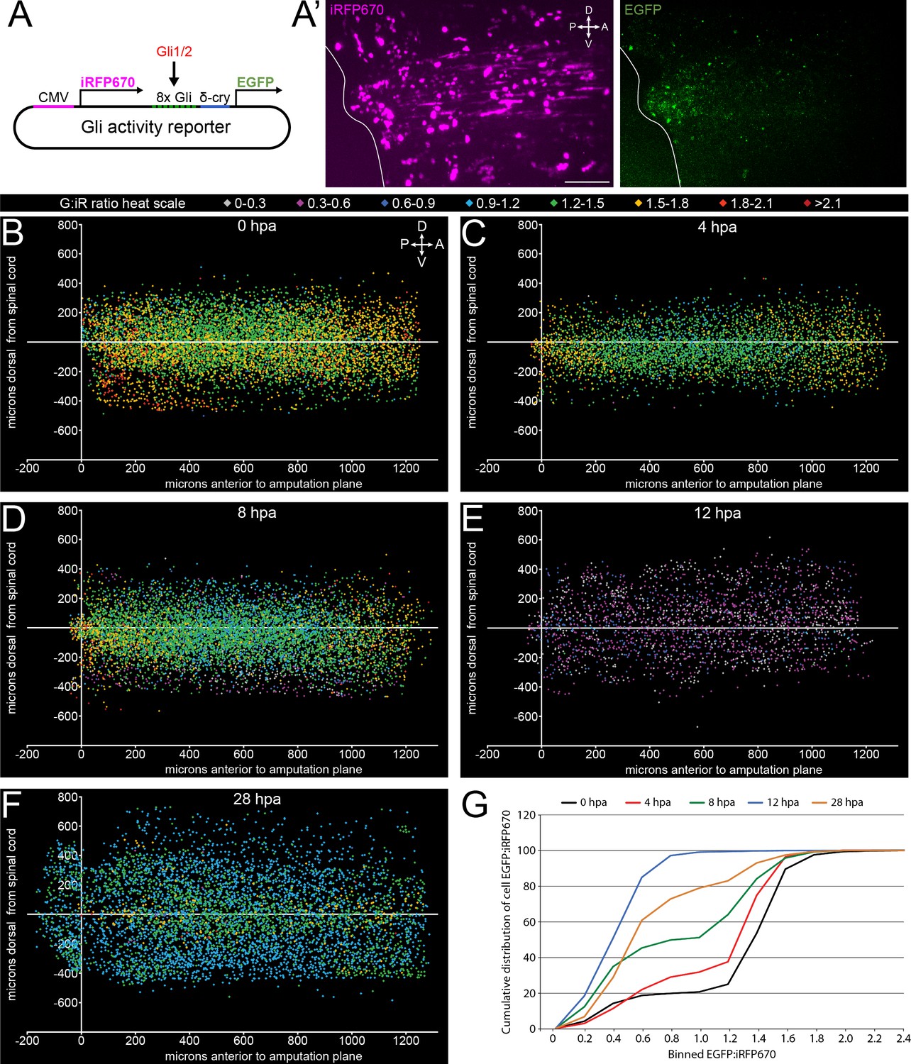 Figure 2. Canonical, Gli-dependent Hedgehog signaling is downregulated following tail amputation.Tails of stage 39–40 larvae expressing the Gli transcriptional activity reporter were amputated, and larvae imaged live at intervals from 0 to 28 h post amputation (hpa). (A) Schematic of bicistronic reporter plasmid. Constitutive promoter CMV drives expression of iRFP670, and minimal δ-crystallin promoter juxtaposed to eight Gli-binding sites drives expression of enhanced green fluorescent protein (EGFP). (A’) Representative z-projections of normalizing factor (iRFP670) and Gli transcriptional activity reporter (EGFP) in amputated larval tail at 12 hpa. White outline represents the edge of the tail. Scale bar, 100 µm. (B–F) 2D composite of EGFP:iRFP670 (G:iR ratio) intensity displayed by heat scale at indicated hpa from combined iRFP670+ cells. Cell location displayed by position relative to amputation plane (x) and dorsal or ventral to the spinal cord (y). (G) Cumulative distribution of EGFP:iRFP670 ratios by time point. All cumulative distribution curves significantly different from control (0 hpa); N of larvae ≥12; p<0.001, all time points compared to 0 hpa, Kolmogorov–Smirnov post-hoc test.Figure 2—source data 1. Canonical, Gli-dependent Hedgehog signaling is downregulated following tail amputation. |