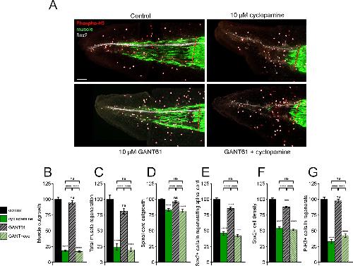 Figure 3. Gli1/2 transcriptional activity is not necessary for spinal cord and muscle regeneration.Stage 39–40 larvae were incubated for 72 h after tail amputation in vehicle (0.1% DMSO, Control) or Gli1/2 antagonist (10 µM GANT61, GANT) and/or 10 µM cyclopamine (cyc), then whole-mount immunostained. (A) Images show representative z-projections for each group at 72 h post amputation (hpa). Transverse red dashed line indicates amputation plane. Scale bar, 100 µm. (B–G) Graphs show mean ± SEM regenerated muscle outgrowth (B) and total volume (C), regenerated spinal cord outgrowth (D), total number (E) and per length density (F) of Sox2+ cells in the regenerated spinal cord, and overall number of phospho-histone H3+ (P-H3+) cells (G) in the regenerate at 72 hpa as % of cohort-matched control, n of larvae: 13–31 per group, N of experiments ≥ 3. ***p<0.001, ****p<0.0001, ns: not significant, ordinary one-way ANOVA, Brown–Forsythe and Welch ANOVA, or Kruskal–Wallis test, followed by Tukey’s, Dunnett’s T3, or Dunn’s multiple comparisons test, respectively, according to prior normality and equality of SDs within and between groups.Figure 3—source data 1. Gli1/2 transcriptional activity is not necessary for spinal cord and muscle regeneration. |