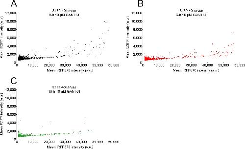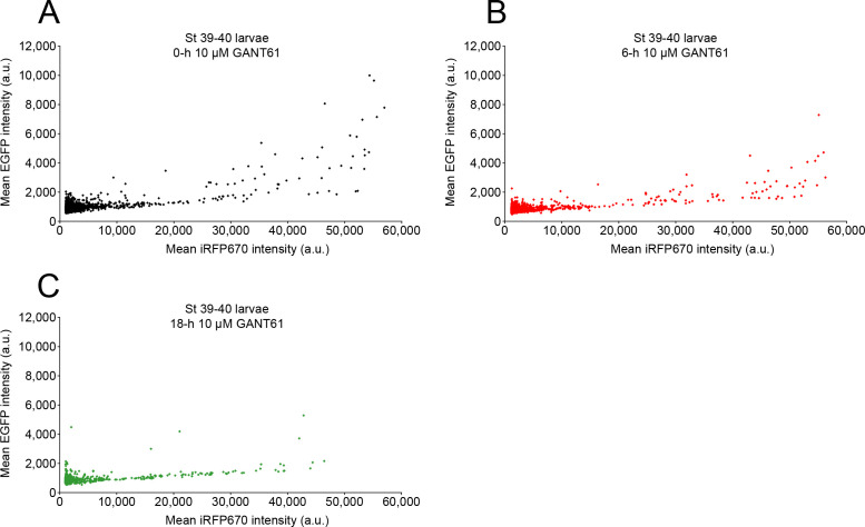 Figure 3—figure supplement 1 Treatment with GANT61 inhibits Gli1/2 transcriptional activity. Stage 39 larvae expressing the Gli transcriptional activity reporter were incubated with 10 µM GANT61 and confocally live-imaged with 488 and 647 nm lasers to acquire the signal corresponding to Gli transcriptional activity (enhanced green fluorescent protein [EGFP]) and expression level for the reporter (iRF670), at 0 (A), 6 (B), and 18 h (C) of incubation. Shown are paired EGFP and iRFP fluorescence intensities for individual cells at the indicated time points. Both 6 h (p=0.015) and 18 h (p<0.0001) time points showed significantly different distribution of EGFP:iRFP670 values from 0 h (Kolmogorov–Smirnov test; N of larvae: 8). |