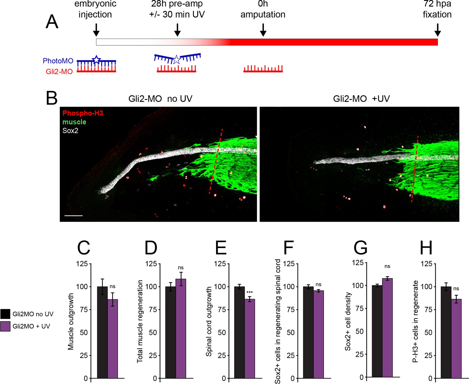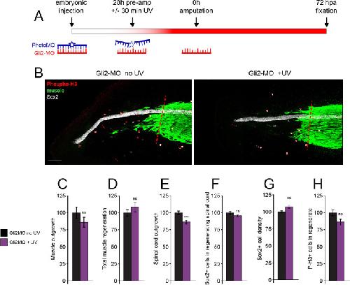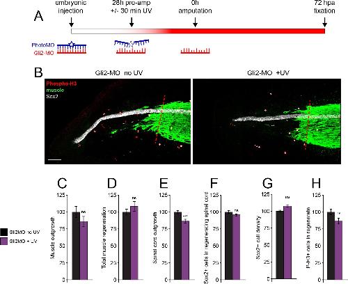 Figure 4. Genetic downregulation of canonical Hedgehog-Smoothened (Hh-Smo) signaling does not affect spinal cord and muscle regeneration.Larvae containing Gli2 morpholino (Gli2-MO) bound to photo-morpholino were UV illuminated (+UV) or not (control, no UV) for 30 min, 28 h before (stage 28) amputation (stage 39–40), to uncage morpholino and induce downregulation of Gli2 expression. (A) Schematic of time course of morpholino activation and amputation. (B) Images show representative z-projections of samples for each group at 72 h post amputation (hpa). Transverse red dashed line indicates amputation plane. Scale bar, 100 µm. (C–H) Graphs show mean ± SEM regenerated muscle outgrowth (C) and total volume (D), regenerated spinal cord outgrowth (E), total number (F) and per length density (G) of Sox2+ cells in the regenerated spinal cord, and overall number of phospho-histone H3+ (P-H3+) cells (H) in the regenerate at 72 hpa as % of cohort-matched control, n of larvae: 16–35 per group, N of experiments ≥ 3. ***p<0.001, ns: not significant, unpaired t-test, Welch’s t-test, or Kolmogorov–Smirnov test, according to prior normality and equality of SDs tests within and between groups.Figure 4—source data 1. Genetic downregulation of canonicalHedgehog-Smoothened(Hh-Smo)signaling does not affect spinal cord and muscle regeneration. |