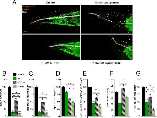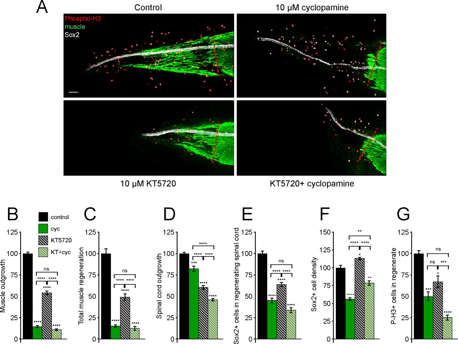 Figure 5 Tissue-specific interaction between PKA and Smoothened (Smo) signaling in regulation of spinal cord and muscle regeneration. Stage 39–40 larvae were incubated for 72 h after tail amputation in vehicle (0.1% DMSO, Control), PKA antagonist (10 µM KT5720, KT), or/and 10 µM cyclopamine (cyc). (A) Images show representative samples for each group at 72 h post amputation (hpa). Transverse red dashed line indicates amputation plane. Scale bar, 100 µm. (B–G) Graphs show mean ± SEM regenerated muscle outgrowth (B) and total volume (C), regenerated spinal cord outgrowth (D), total number (E) and per length density (F) of Sox2+ cells in the regenerated spinal cord, and overall number of phospho-histone H3+ (P-H3+) cells (G) in the regenerate at 72 hpa as % of cohort-matched control, n of larvae: 11–29 per group, N of experiments ≥ 3. *p<0.05, **p<0.01, ***p<0.001, ****p<0.0001, ns: not significant, ordinary one-way ANOVA, Brown–Forsythe and Welch ANOVA, or Kruskal–Wallis test, followed by Tukey’s, Dunnett’s T3, or Dunn’s multiple comparisons test, respectively, according to prior normality and equality of SDs within and between groups. |