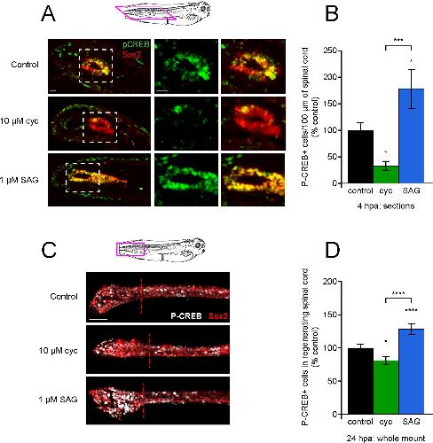 Figure 7 Post-amputation activation of CREB is regulated by Hedgehog (Hh) signaling. Stage 39–40 larvae were amputated in vehicle (0.1% DMSO, control), 10 µM cyclopamine, or 1 µM SAG, then fixed at either 4 or 24 h post amputation (hpa) and processed for immunostaining in either paraffin sections (A, B), or whole-mounts (C, D), respectively. (A) Representative longitudinal sections from 4 hpa. Sample orientation displayed in schematic. Scale bars, 20 µm. (B) Graph shows mean ± SEM P-CREB+ cell count in 100-µm-long spinal cord within 400 µm of the amputation plane as % of control, n of larvae ≥5 per group from N = 3 independent experiments. (C) Representative whole-mount sections from 24 hpa. Sample orientation displayed in schematic. Scale bar, 50 µm. (D) Graph shows mean ± SEM P-CREB+ cell count in the regenerated spinal cord, normalized to cohort matched controls, n of larvae ≥12 per group from N = 3 separate experiments. In (B, D), *p<0.05, ***p<0.001, ****p<0.0001, one-way ANOVA + Holm–Sidak’s multiple comparison. |