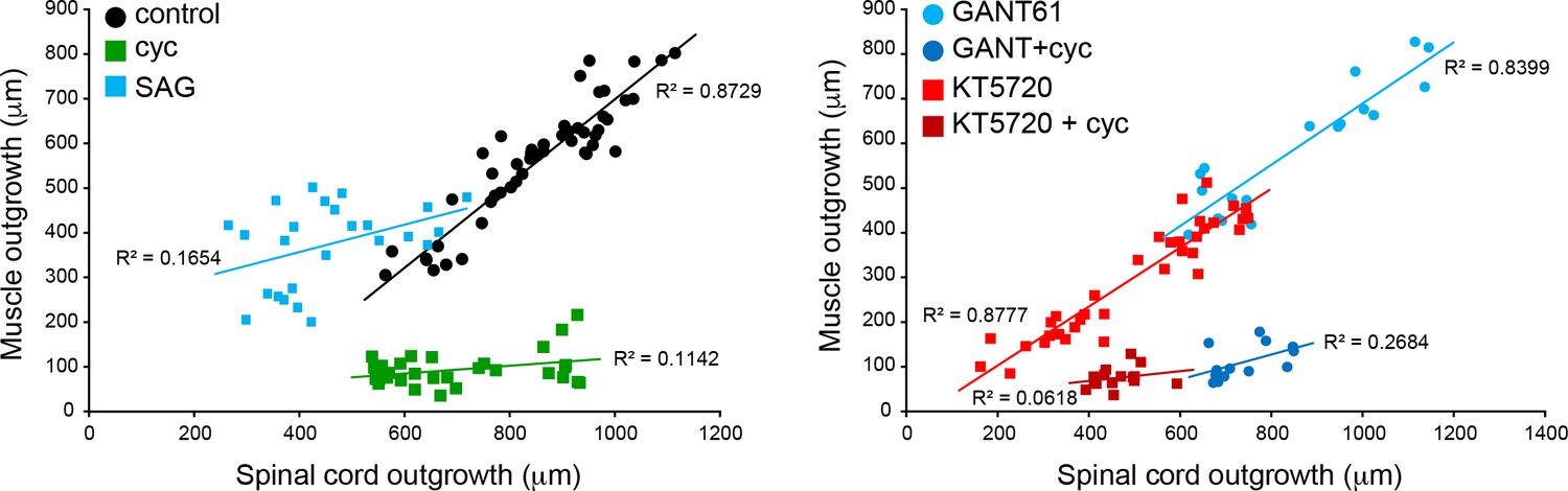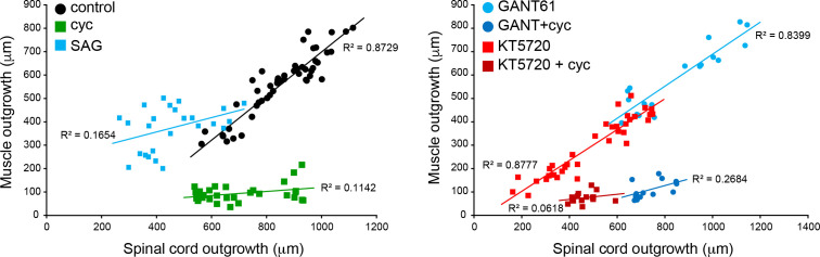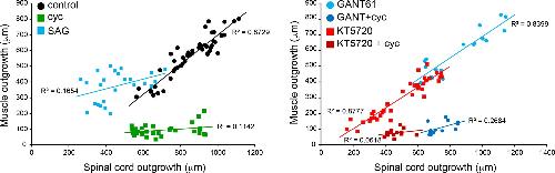 Figure 8 Coordination of spinal cord and muscle outgrowth in the regenerating tail is dependent on Smoothened (Smo) signaling. Individual samples for each treatment are displayed by total outgrowth for spinal cord (X) and muscle (Y). Simple linear regression lines are fit for each treatment, and R2 goodness-of-fit values displayed by each line. N = 13–39 samples per group. |