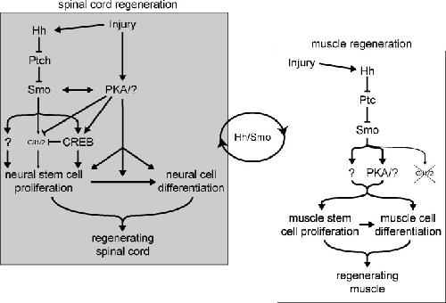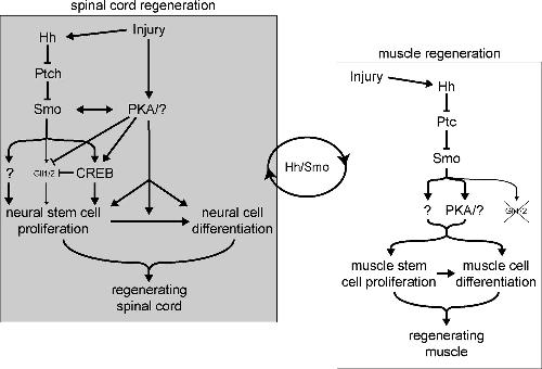 Figure 9 Model for Hedgehog (Hh)-dependent regulation of spinal cord and muscle regeneration. Injury recruits non-canonical Hh signaling in the spinal cord to activate neural stem cells for replenishing the regenerating spinal cord. Injury also activates PKA which acts independently from Smoothened (Smo) on neural stem cell proliferation to promote spinal cord regeneration. Non-canonical Hh signaling is also essential for muscle regeneration starting from the initial stages post injury, where PKA appears to be downstream of Smo activation. The coordination between the magnitude of regenerating spinal cord and muscle outgrowth is dependent on non-canonical Hh/Smo signaling. |
