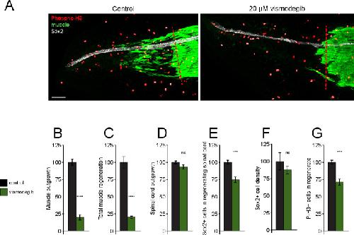 Figure 1—figure supplement 2. Treatment with Smoothened (Smo) antagonist vismodegib reduces muscle and spinal cord regeneration.Stage 39–40 X. laevis larvae were incubated with vehicle (0.1% DMSO, Control) or 20 µM vismodegib for 72 hr, then immunostained. (A) Representative z-projections of whole-mount immunostained samples for both groups at 72 h post amputation (hpa). Transverse red dashed line indicates amputation plane. Scale bar 100 µm. (B–G) Graphs show mean ± SEM regenerated muscle outgrowth (B) and total new muscle volume (C), regenerated spinal cord outgrowth (D), total number (E) and per length density (F) of Sox2+ cells in the regenerated spinal cord, and number of phospho-histone H3+ (P-H3+) cells (G) in the regenerate at 72 hpa as % of cohort-matched control. N of larvae: 8–10 samples per group. ***p<0.001, ****p<0.0001, ns: not significant, two-tailed t-test. |