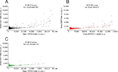 Figure 3—figure supplement 1. Treatment with GANT61 inhibits Gli1/2 transcriptional activity.Stage 39 larvae expressing the Gli transcriptional activity reporter were incubated with 10 µM GANT61 and confocally live-imaged with 488 and 647 nm lasers to acquire the signal corresponding to Gli transcriptional activity (enhanced green fluorescent protein [EGFP]) and expression level for the reporter (iRF670), at 0 (A), 6 (B), and 18 h (C) of incubation. Shown are paired EGFP and iRFP fluorescence intensities for individual cells at the indicated time points. Both 6 h (p=0.015) and 18 h (p<0.0001) time points showed significantly different distribution of EGFP:iRFP670 values from 0 h (Kolmogorov–Smirnov test; N of larvae: 8).Figure 3—figure supplement 1—source data 1. Treatment with GANT61 inhibits Gli1/2 transcriptional activity. |