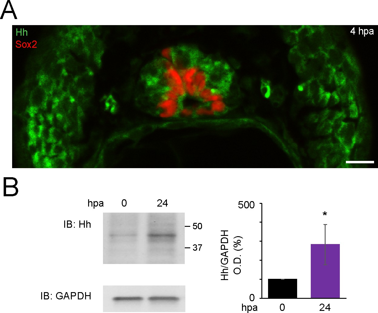 Figure 1—figure supplement 1 Expression of Hedgehog (Hh) ligands is apparent in stage 40 larvae and increases after amputation in the regenerating tail. (A) Representative image of transverse section of tail from 4 h post amputation (hpa) stage 40 larva, stained for Sox2 and Hh (5E1 antibody that recognizes Xenopus Sonic hedgehog [Shh] and Ihh). Scale bar, 10 μm. (B) Representative western blot assay of whole-cell lysates from 500-μm-long most posterior tail from stage 40 larvae right after (0 hpa) and 24 hpa. Predicted full-length Hh MW 45–47 kD. GAPDH (bottom) was used as loading control. Graph shows mean ± SEM% of 0 hpa Hh/GAPDH optical density (O.D.), n = 18 larvae per group, N = 3 experiments, *p<0.05, paired t-test. |