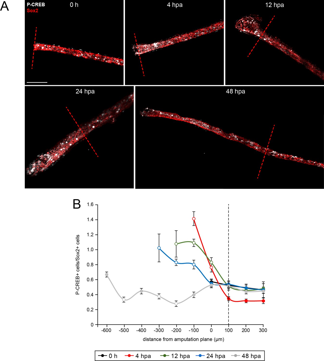 Figure 6 Spatiotemporal activation of CREB in the injured and regenerated spinal cord. Stage 39–40 larvae were amputated and processed for whole-mount immunostaining at the indicated hour post amputation (hpa), with the exception of the 0 h group, which was first fixed and then amputated to represent the pre-amputation group. (A) Images show representative z-projections of immunostained samples for each group that were digitally processed to isolate spinal-cord associated P-CREB. Transverse red dashed line indicates amputation plane. Scale bar, 100 µm. (B) Graph shows mean ± SEM number of total P-CREB+ cells normalized to number of Sox2+ cells in 100 µm sections of spinal cord anterior (positive) and posterior (negative) to the amputation plane (0). N of larvae ≥5 per group. Open circles denote p<0.05 vs. time-matched average number of P-CREB+/Sox2+ cells within the region 100–200 µm anterior (100 µm, dashed black line) to the amputation plane (0 µm), one-way ANOVA. |