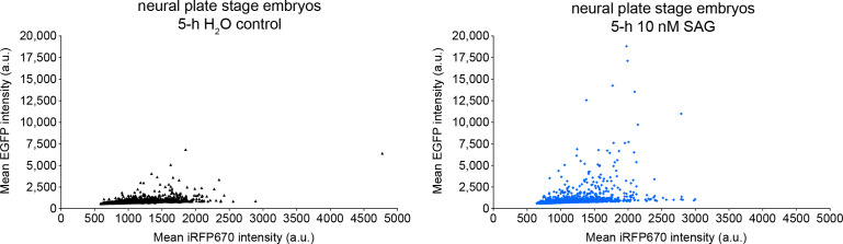 Figure 2—figure supplement 1 Positive control for Gli transcriptional activity reporter. Neural plate stage embryos (18 h post-fertilization) expressing Gli transcriptional activity reporter were incubated in the presence or absence of 10 nM SAG for 5 h followed by live confocal imaging with 488 and 647 nm lasers to acquire the signal corresponding to Gli transcriptional activity (enhanced green fluorescent protein [EGFP]) and expression level for the reporter (iRF670). Individual cells displayed by iRFP670 (x) vs. EGFP (y) fluorescence intensities in control and experimental embryos. Distribution of control vs. SAG EGFP:iRFP670 values significantly different by Kolmogorov–Smirnov test (p<0.0001; N of embryos per condition: 8). |