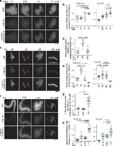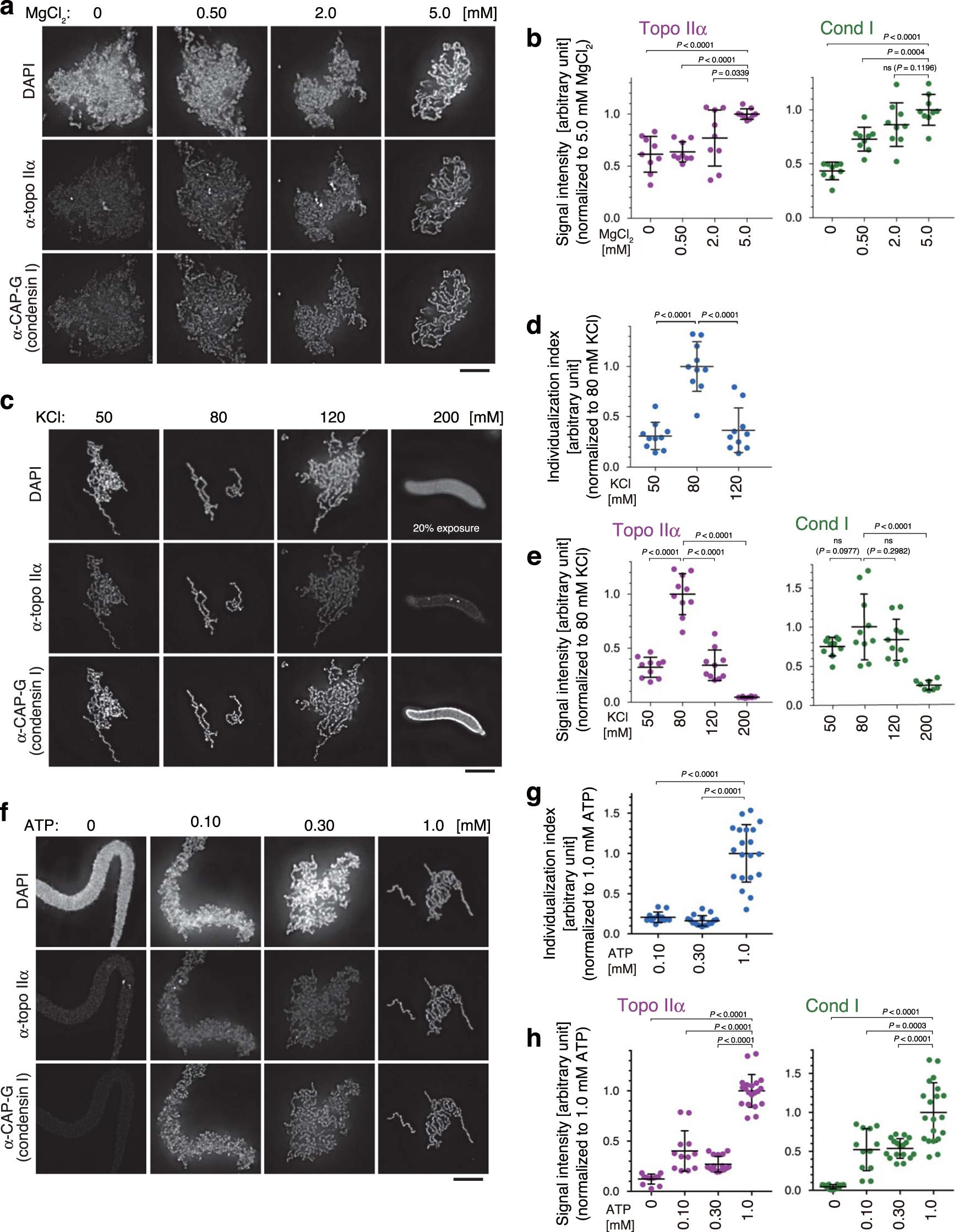 Fig. 1: Manipulation of buffer conditions in the mitotic chromatid reconstitution assay. a, b Xenopus sperm nuclei were mixed with a cocktail of six purified proteins (topo IIα, condensin I, a truncated version of histone H2A.XF-H2B dimer, Npm2, Nap1, and FACT) in a buffer containing no MgCl2 or increasing concentrations of MgCl2. The concentrations of other chemical ingredients in the buffer are listed in Table 1. After a 150-min incubation at 22â°C, the resultant structures were fixed and labeled with antibodies against topo IIα and CAP-G (a subunit of condensin I). DNA was counterstained with DAPI (a). Integral signal intensities of topo IIα or CAP-G were divided by those of DAPI in the same segmented region, and the values normalized to the average value in the reaction containing 5.0âmM MgCl2 are plotted. The meanâ±âs.d. is shown (nâ=â9 clusters of chromatin). P values were assessed by two-tailed Welchâs t-test (ns, not significant) (b). câe KCl concentrations were titrated in the reconstitution assay. Immunolabeling and signal quantification were carried out as above (c, e). The perimeter of a DAPI-positive segmented area was divided by the integral intensity of DAPI in the same area, and the resultant values are plotted as individualization indices (d). The meanâ±âs.d. is shown. The sample sizes (n, the number of clusters of chromatin) are 10 (50, 80, and 120 mM KCl) and 8 (200âmM KCl). P values were assessed by two-tailed Welchâs t-test (ns, not significant) (d, e). fâh ATP concentrations were titrated in the reconstitution assay (f). Individualization indices and signal intensities were analyzed as above. The meanâ±âs.d. is shown. The sample sizes (n, the number of clusters of chromatin) are 12 (0 and 0.10âmM ATP), 17 (0.30âmM ATP) and 20 (1.0âmM KCl). P values were assessed by a two-tailed Welchâs t-test. ns not significant (g, h). Bars, 5âµm. |
