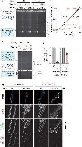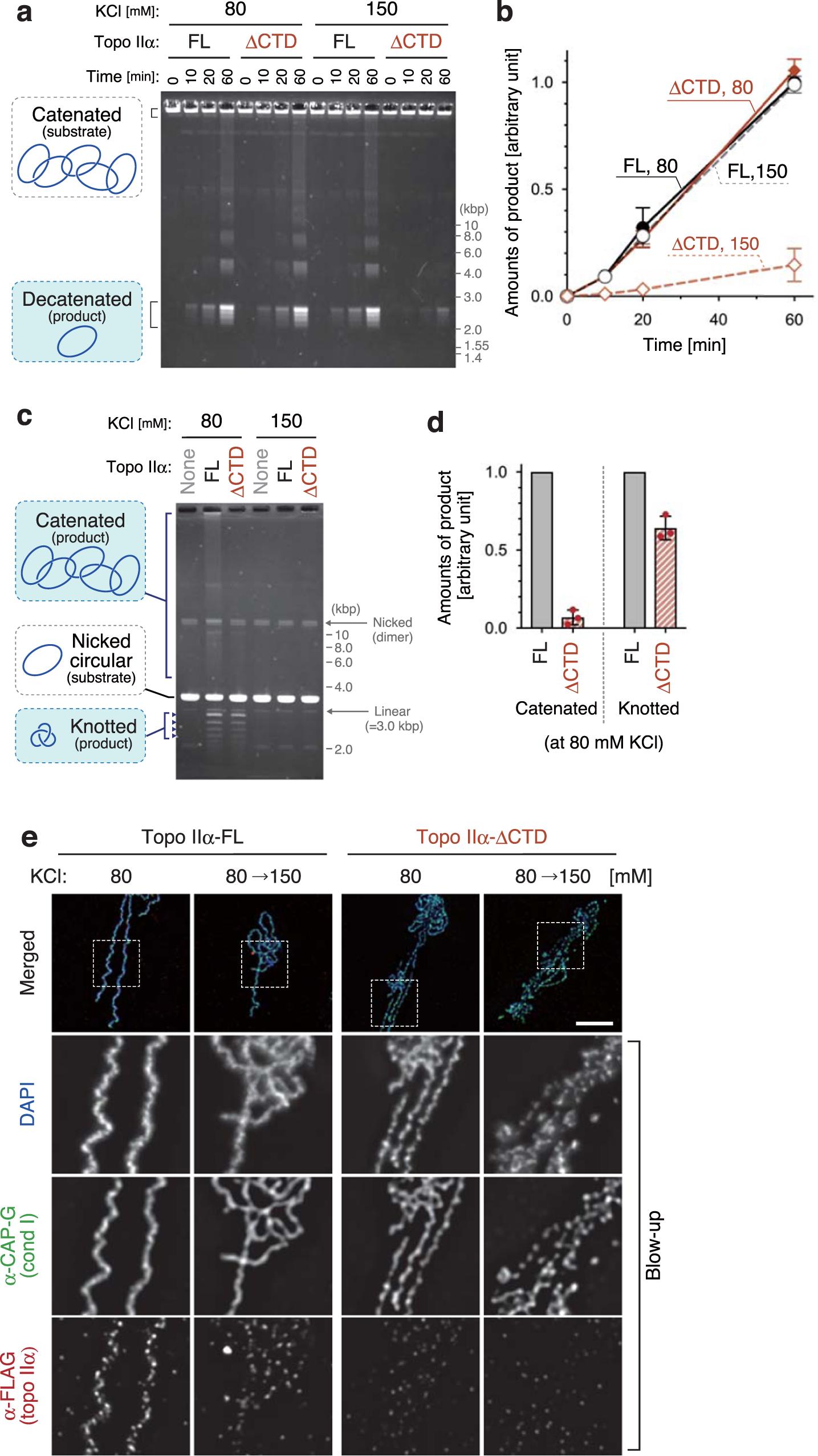 Fig. 3: Topo IIα-ÎCTD is proficient in DNA decatenation but is deficient in DNA catenation a, b Catenated DNA (100âng) was mixed with a low amount (40âng) of topo IIα-FL or topo IIα-ÎCTD in a buffer containing 2âmM ATP, 5âmM MgCl2, and either 80âmM or 150âmM KCl. After incubation at 22â°C, the resultant DNAs were recovered at the indicated time points, purified, and analyzed by agarose gel electrophoresis. The gel was stained with ethidium bromide (a). Intensities of decatenated DNA were quantified. The meanâ±âs.d. from three independent experiments is shown (b). c, d Nicked circular DNA (100âng) was mixed with an excess amount (400âng) of topo IIα-FL or topo IIα-ÎCTD in a buffer containing 5âmM MgCl2, and either 80âmM or 150âmM KCl. After a 10-min incubation at 22â°C, the reactions were supplemented with 2âmM AMP-PNP and incubated for another 20âmin. The DNAs were then purified and analyzed by agarose gel electrophoresis (c). Intensities of catenated and knotted DNAs were quantified. In each experiment, values of the topo IIα-ÎCTD reaction were normalized to those of the topo IIα-FL reaction. The meanâ±âs.d. from three independent experiments is shown (d). e Chromatid reconstitution assays were performed with topo IIα-FL or topo IIα-ÎCTD in a buffer containing 80âmM KCl. After a 150-min incubation at 22â°C, the mixtures were diluted by adding the same volume of reaction mixtures containing 80âmM KCl or 220âmM KCl so that the final concentrations of KCl became 80âmM or 150âmM. After another 20-min incubation at 22â°C, the resultant chromosomes were fixed and processed for immunolabeling. Blow-up images of cropped parts (indicated by the dashed rectangles in the merged images) are shown in grayscale. This experiment was repeated three times with similar results. Bar, 5âµm. |